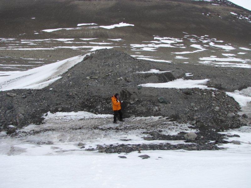 Mike and I had a very productive day mapping and sampling, and have several interesting hypotheses for the glaciological phenomena that we have observed. We need to be careful sampling rounded granite boulders, as they may originate from the Cretaceous conglomerate bedrock. Ian went and searched out ground control points to aid my map making and correct positioning of our aerial photographs. He joked that he was getting paid to go orienteering, a hobby of his. We communicated via small hand-held VHF (Very High Frequency) radios. He was finished earlier than us and headed back to camp to do some sorting, cut some snow blocks, and to start boiling water. He seems to have infinite energy!
