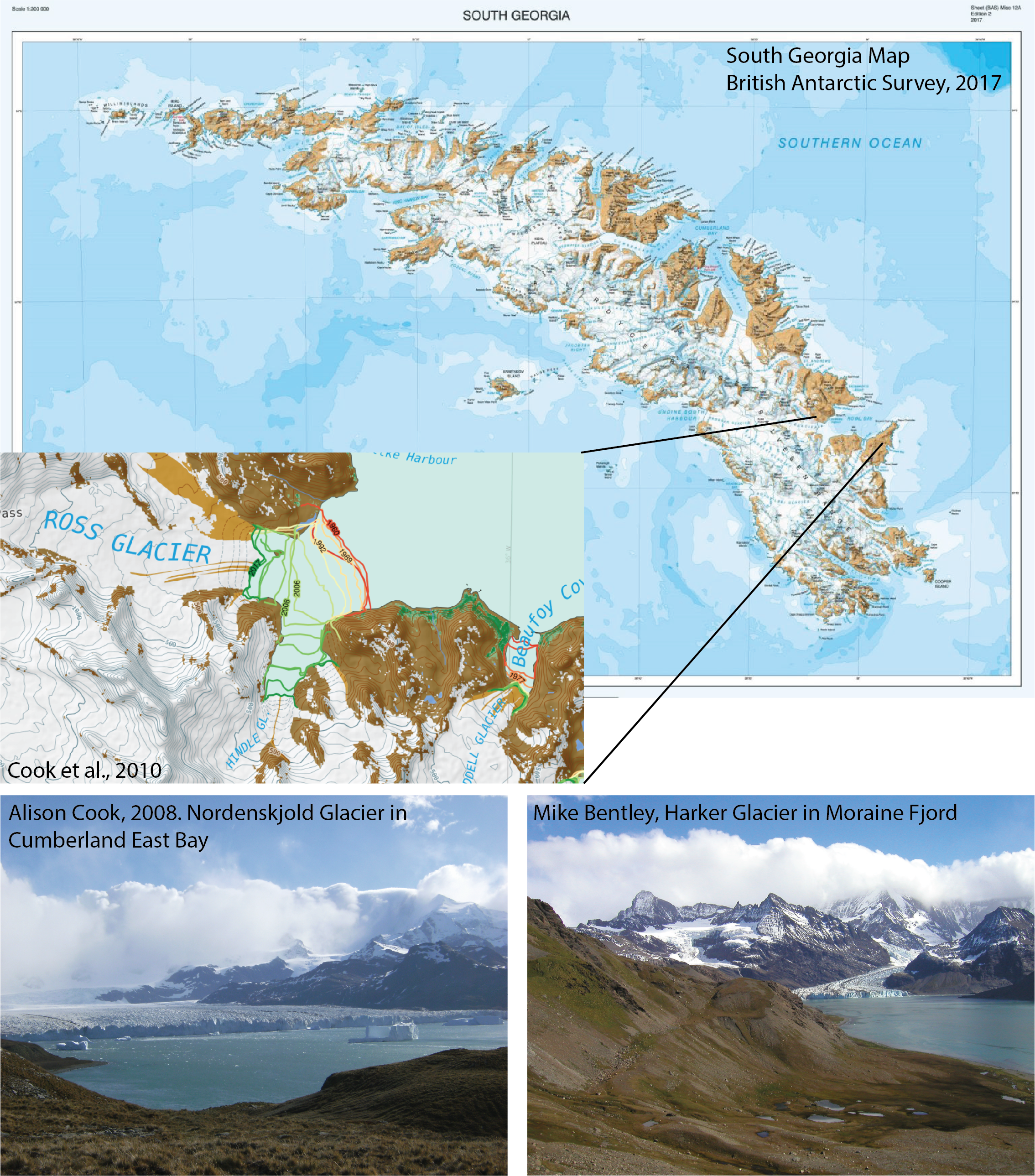 The glaciers of the Subantarctic island of South Georgia are sentinels of climate change, being located directly in the path of the rapidly evolving Southern Hemisphere Westerlies. These Westerlies are a critical control on glacier behaviour both in Patagonia and the Antarctic Peninsula. South Georgia therefore offers a unique opportunity to investigate how changes in the Westerlies are reflected in glacier change.